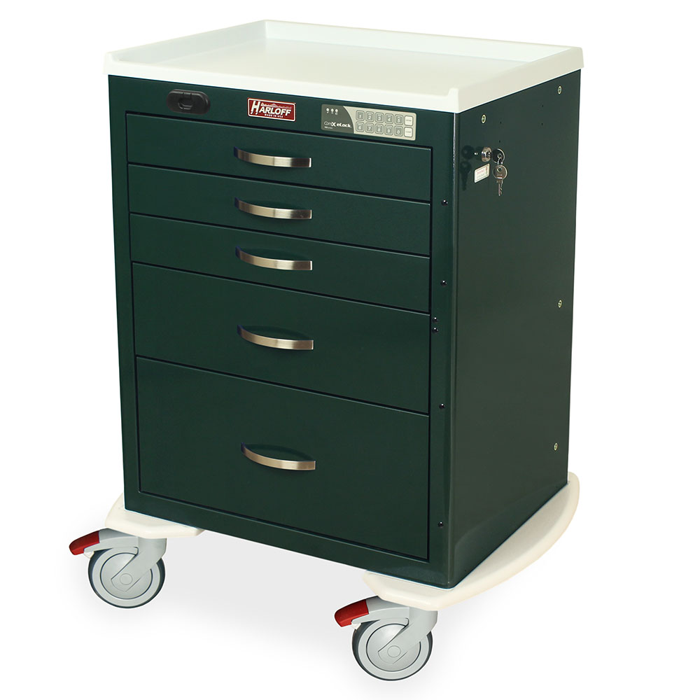 This model is one of the most secure anesthesia carts available on today’s market. The MDS2424ELP05 features an electronic keypad lock with a proximity reader that only grants access to certified individuals with an HID compatible badge. This heavy-duty steel cart is designed with five drawers that offer 24″ of vertical drawer space. Other distinguishing features for this cart include a white plastic top, ergonomic push handles, 5” ball-bearing casters, full-extension drawer slides, elegant drawer pulls and protective stabilizing pontoon bumpers. M-Series carts like this one give you options. The MDS2424ELP05 replaces the Classic model 4245ELP.