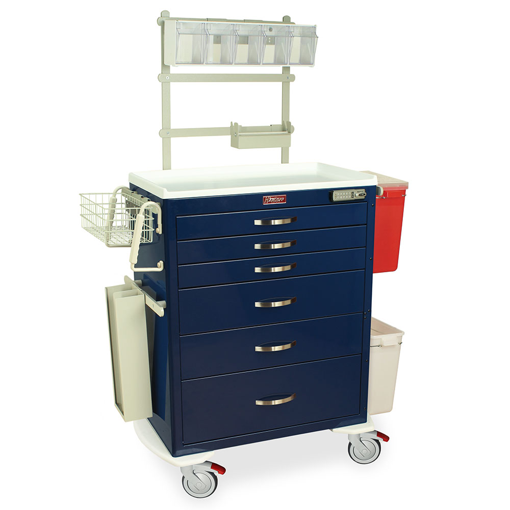 This M-Series cart for anesthesiology is designed and built to meet the requirements of today’s healthcare market. Ergonomic side handles, comfort drawer pulls, expanded lock options and a standard plastic top makes things easier for your staff and supports your infection control initiatives. M-Series carts offer you choices. The MDS3030E06+MD30-ANS3 replaces M-Series model MDS3030E06-ANS3 and Classic model 7456E.