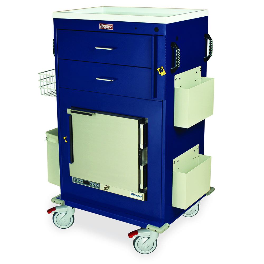 Malignant Hyperthermia carts combine storage space for syringes, IV supplies, Dantrolene and sterile water combined with refrigerated storage for insulin, ice packs and saline. Harloff’s Malignant Hyperthermia Cart with Refrigerator provides portable storage with easy access, and meets AANA (American Association of Nurse Anesthetists) and MHAUS (Malignant Hyperthermia Association of the United States) suggestions to have the right supplies organized and quickly available.