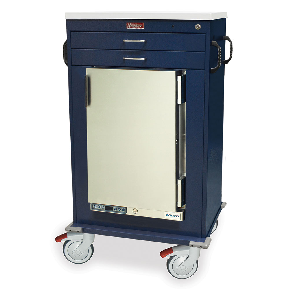 MH Cart contents can include syringes, IV supplies, Dantrolene and sterile water and are combined with refrigerated storage for insulin, ice packs and saline. This Harloff MH Cart provides portable storage with easy access, and meets AANA (American Association of Nurse Anesthetists) and MHAUS (Malignant Hyperthermia Association of the United States) suggestions to have the right supplies organized and quickly available.