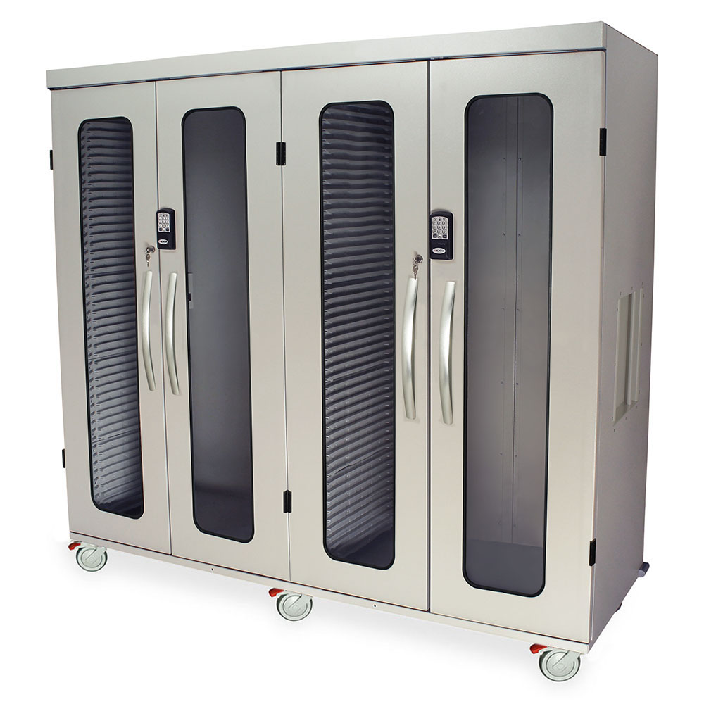 The Quad column medical grade storage cabinet has tempered glass doors and plastic interior side panels of 98 slide tracks (49 per column) to hold various shelves. This cabinet can be configured for use in Arthroscopy, Cardiology, Catheterization, Cystoscopy, Endovascular Labs, ENT, Interventional Radiology, Laparoscopy, Ophthalmology, Orthopedic, Neurology, Urology and Vascular.