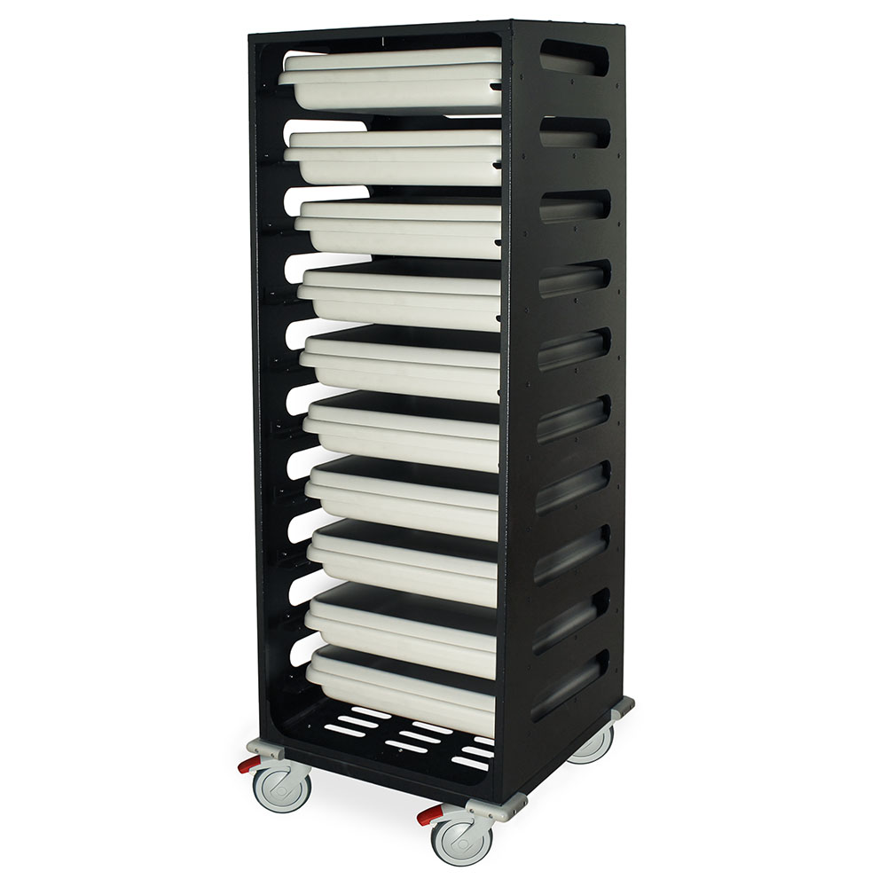 Designed for the storage and safe transport of flexible endoscope transport containers. Scope container transport carts can be color coded to signify clean, patient ready scopes versus soiled scopes needing reprocessing. Each endoscopy tower securely holds most popular brands of scope trays.