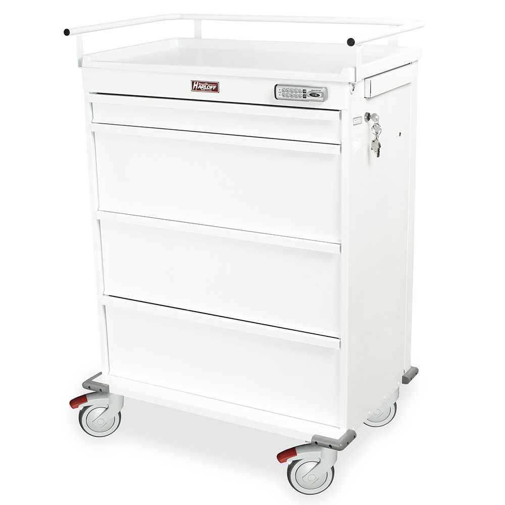 This med cart for sale from Harloff is designed to meet the storage needs of an individual, a group home or a large nursing unit. Our steel, aluminum, wood look and value lines offer top quality medication cart locks and storage solutions at price points to meet your budget. A complete line of accessories and narcotics storage optimize your cart’s usefulness to nursing staff.